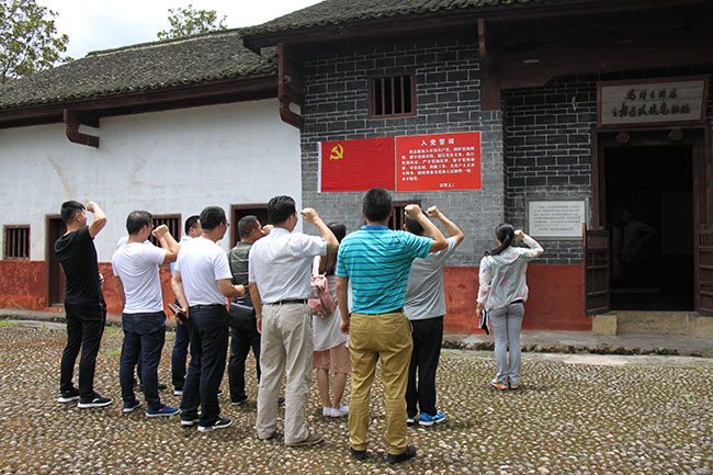 隨后,一行人到達水口鎮連隊建黨舊址。水口鎮連隊建黨舊址——葉家祠1972年被公布為湖南省重點文物保護單位,已被定為株洲市愛國主義教育基地。祠堂門口懸掛著鮮明的黨旗及入黨誓詞,肅穆莊嚴,公司黨員在此重新宣讀入黨誓詞,內心激動澎湃的感情溢于言表。誓詞提醒著每一位黨員的承諾與信仰,他們將牢記自己的使命,從群眾中來到群眾中去,發揮黨員帶頭作用。